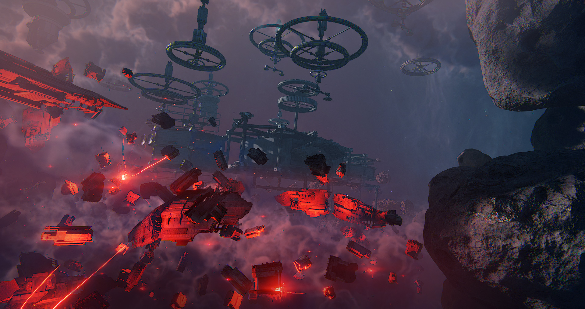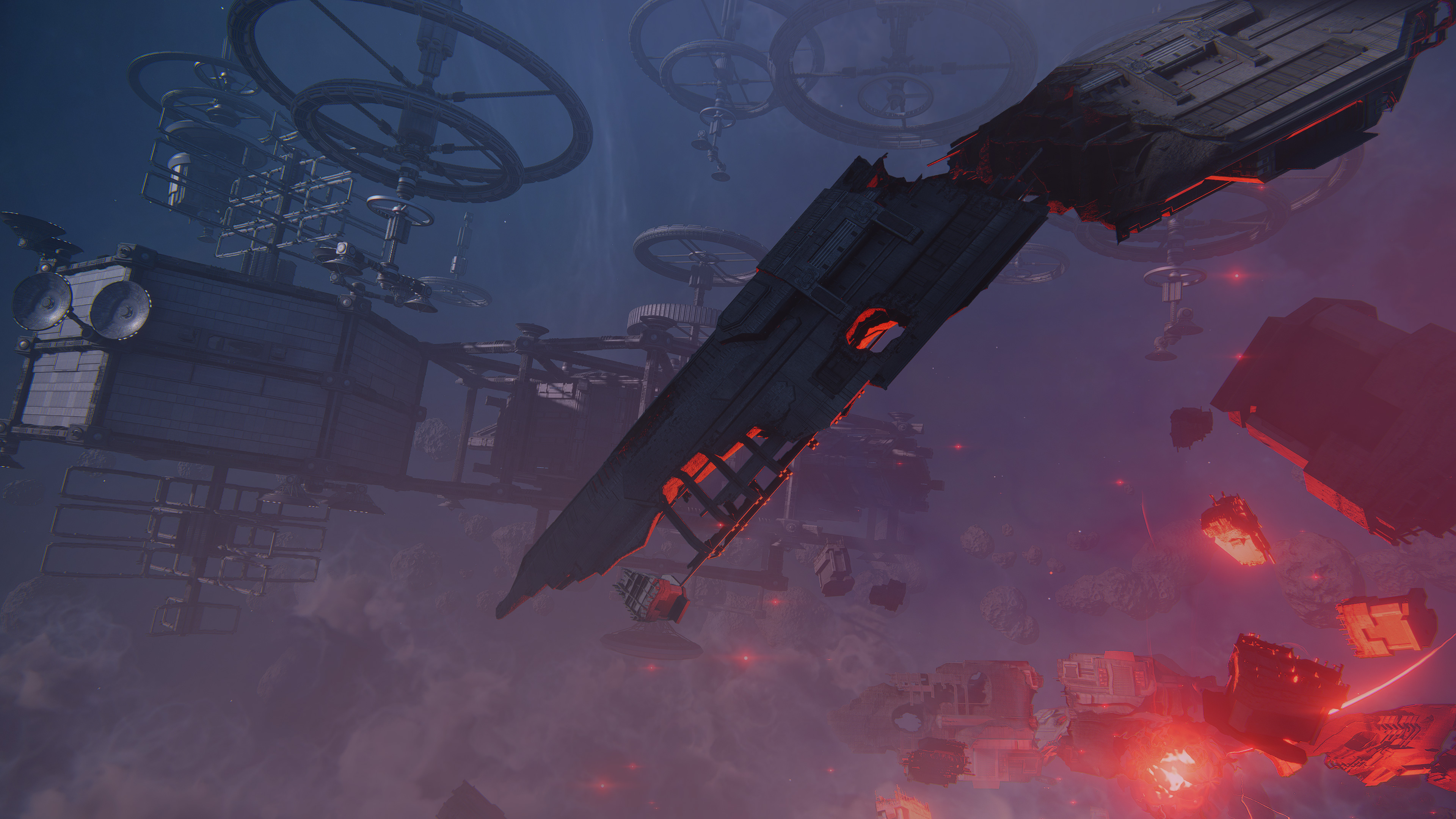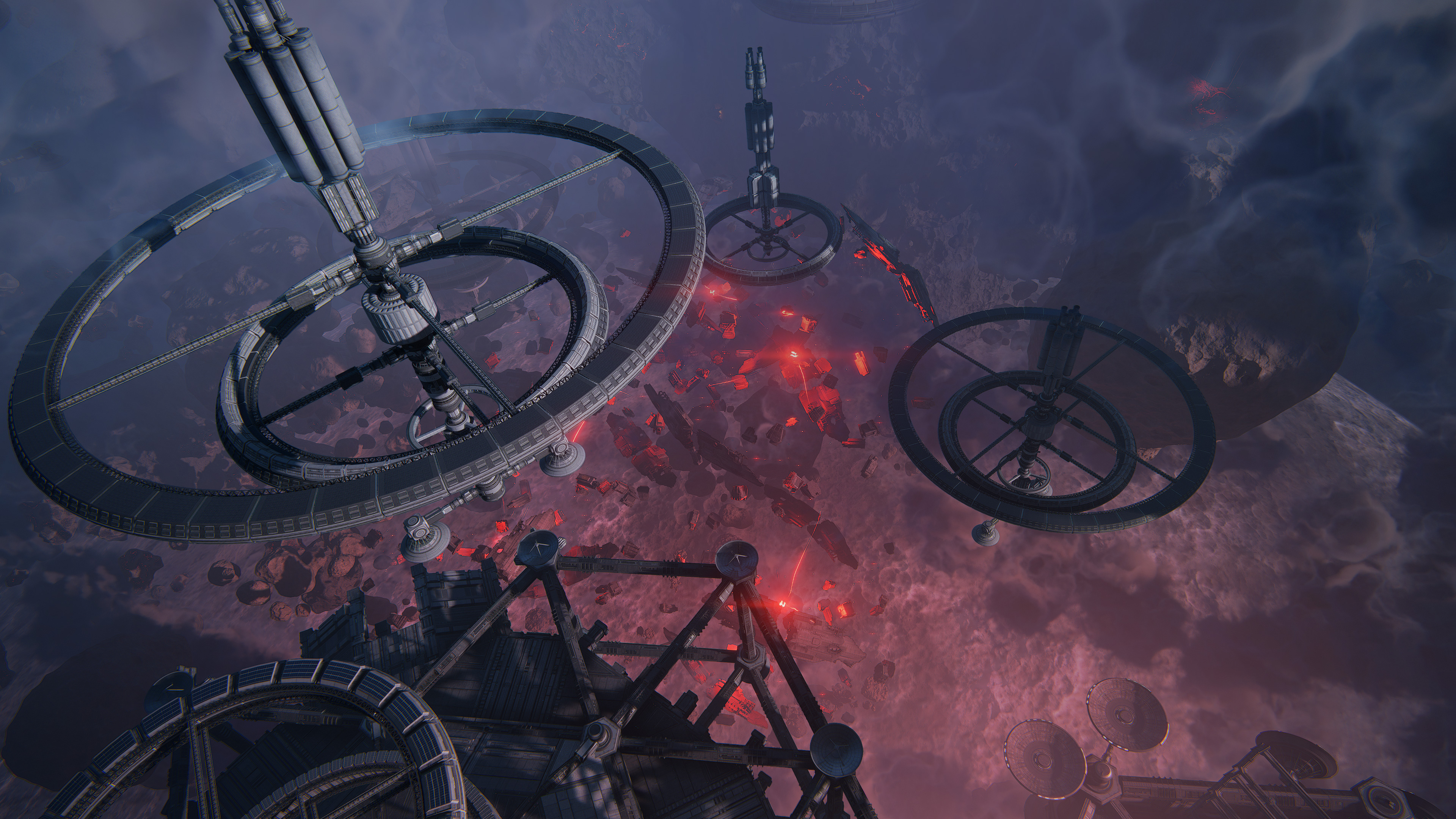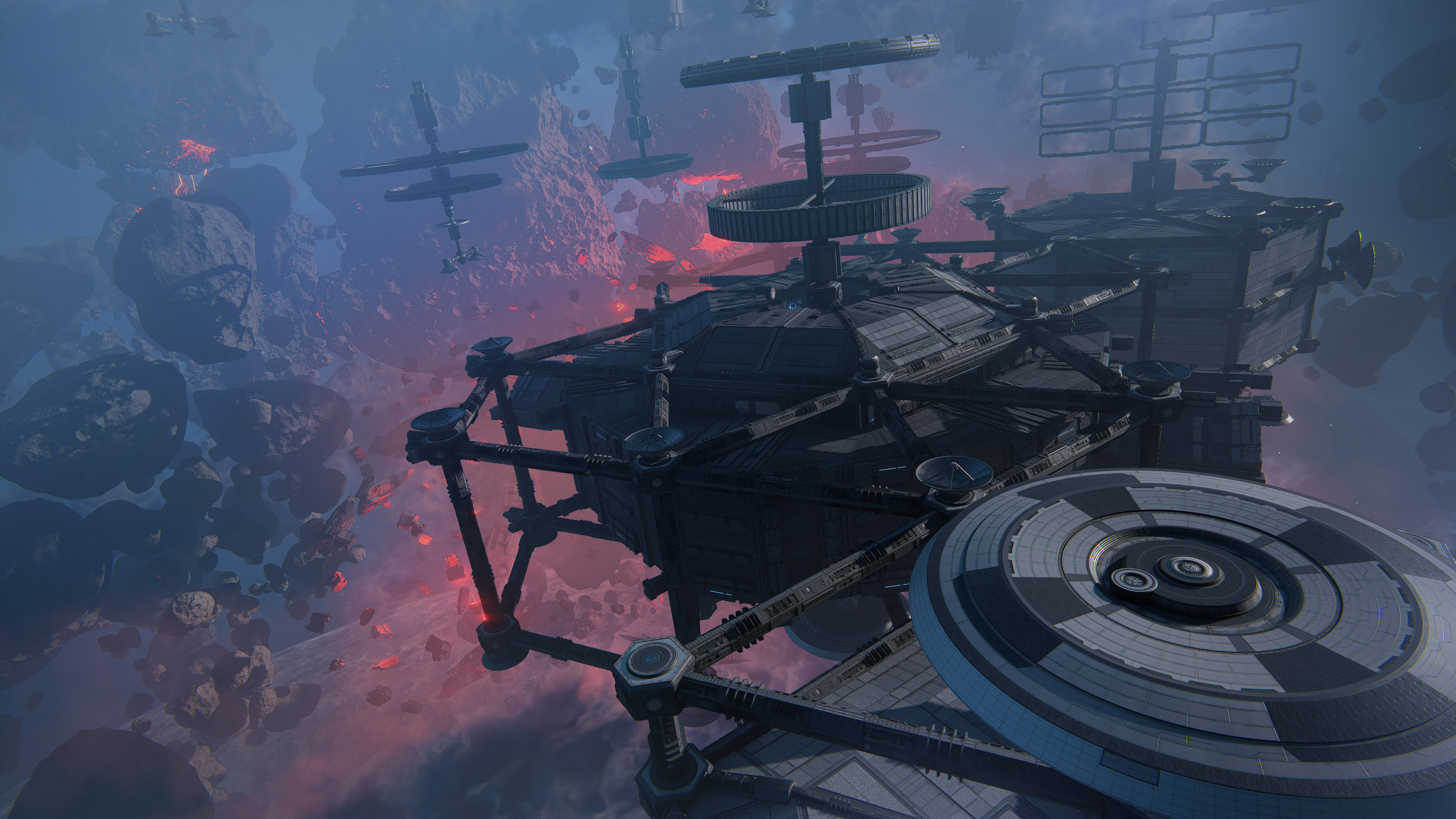 Mining coordination stations and ore reception and primary collection hubs are located on the asteroids. The infrastructure is partially shut down, but a significant portion of the facilities remains intact.